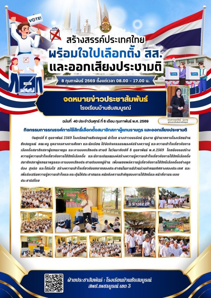 วันศุกร์ที่ 6 กุมภาพันธ์ 2569 โรงเรียนบ้านซับสมบูรณ์ นำโดย นางสาวอมรรัตน์ มุ่งงาม ผู้อำนวยการโรงเรียนบ้านซับสมบูรณ์ คณะครู บุคลากรทางการศึกษา และนักเรียน ได้จัดกิจกรรมรณรงค์สร้างความรู้ และความเข้าใจเกี่ยวกับการเลือกตั้งสมาชิกสภาผู้แทนราษฎร และการออกเสียงประชามติ ในวันอาทิตย์ที่ 8 กุมภาพันธ์ พ.ศ.2569 โดยมีอบรมสร้างความรู้ความเข้าใจเกี่ยวกับการใช้สิทธิ์เลือกตั้ง และมีการเดินรณรงค์สร้างความรู้ความเข้าใจเกี่ยวกับการใช้สิทธิ์เลือกตั้งสมาชิกสภาผู้แทนราษฎรและการออกเสียงประชามติรอบหมู่บ้าน เพื่อเผยแพร่ความรู้เกี่ยวกับการใช้สิทธิ์เลือกตั้งอย่างถูกต้อง สุจริต และโปร่งใส สร้างความเข้าใจเกี่ยวกับบทบาทของประชาชนในการมีส่วนร่วมกำหนดทิศทางของประเทศ และเพื่อส่งเสริมความรู้ความเข้าใจและกระตุ้นให้ประชาชนตระหนักถึงความสำคัญของการใช้สิทธิ์และหน้าที่ตามระบอบประชาธิปไตย