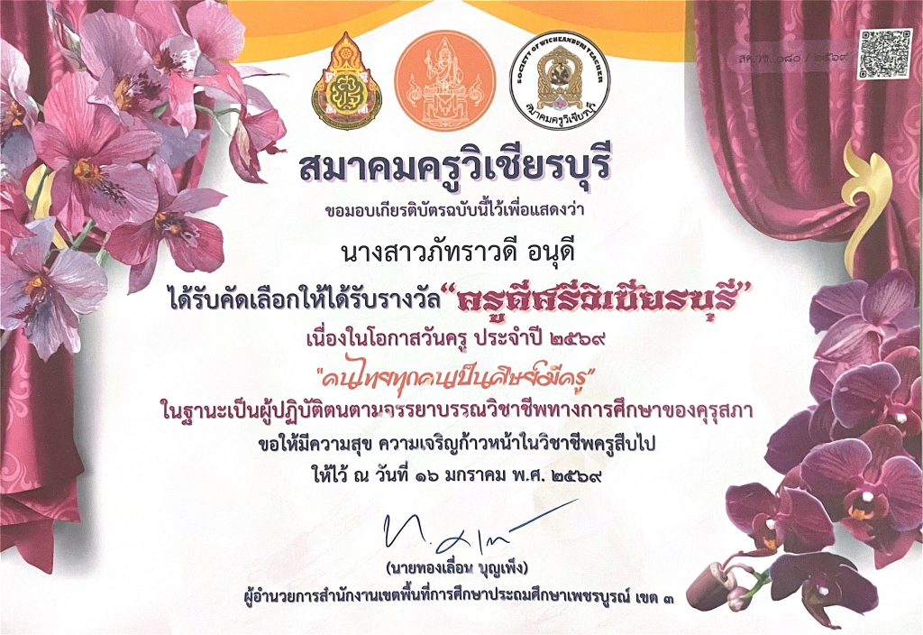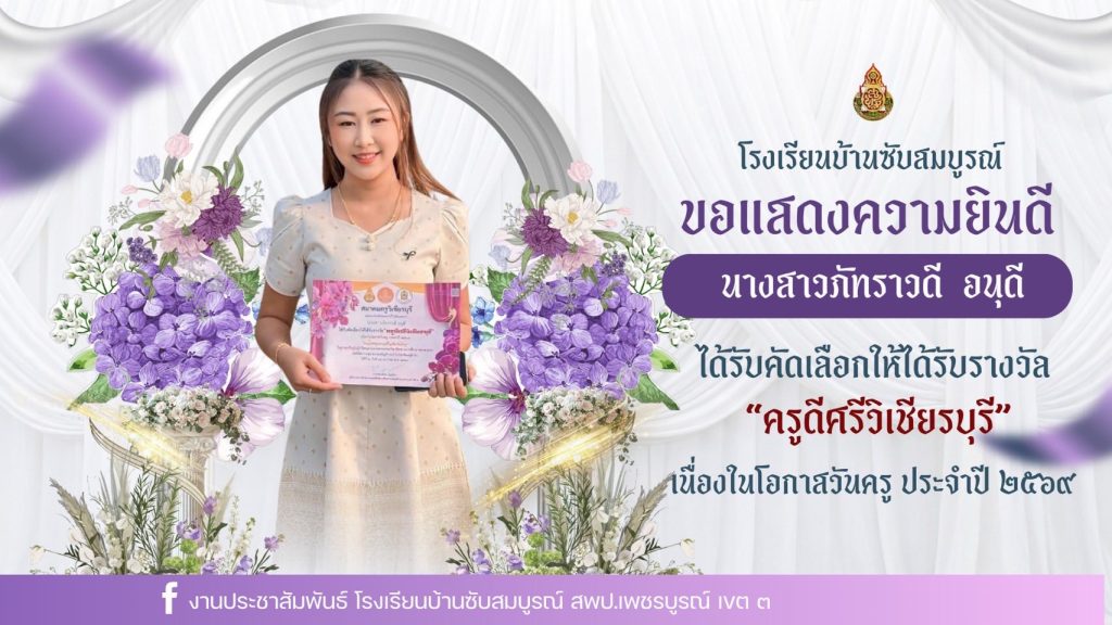 โรงเรียนบ้านซับสมบูรณ์ ขอแสดงความยินดีกับคุณครูภัทราวดี อนุดี ได้รับคัดเลือกให้ได้รับรางวัล “ครูดีศรีวิเชียรบุรี” เนื่องในงานวันครู ประจำปี 2569