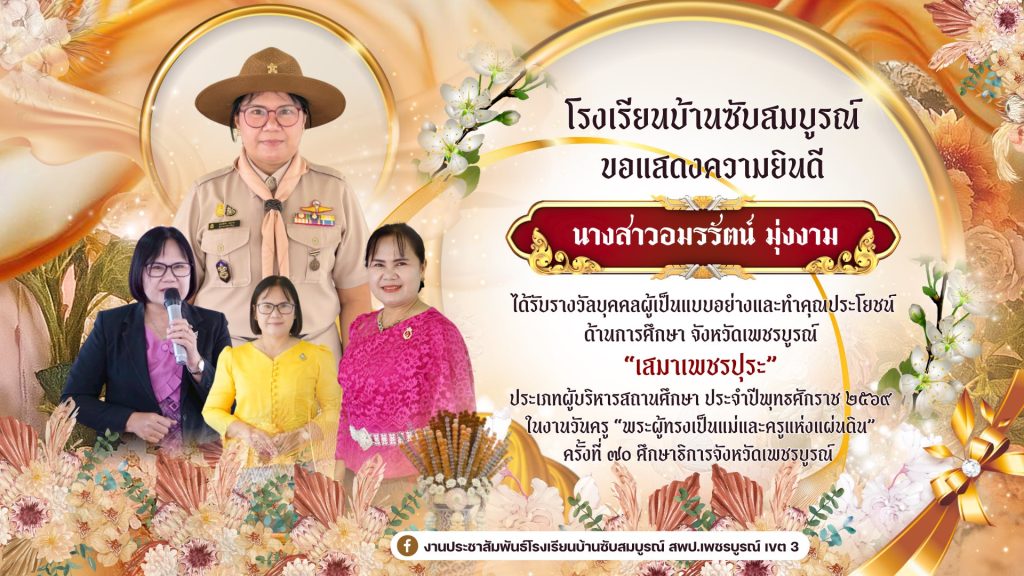โรงเรียนบ้านซับสมบูรณ์ขอแสดงความยินดีกับ นางสาวอมรรัตน์ มุ่งงาม ผู้อำนวยการโรงเรียนบ้านซับสมบูรณ์ ได้รับรางวัลบุคคลผู้เป็นแบบอย่างและทำคุณประโยชน์ ด้านการศึกษาจังหวัดเพชรบูรณ์ “เสมาเพชรปุระ” ประเภทผู้บริหารสถานศึกษา